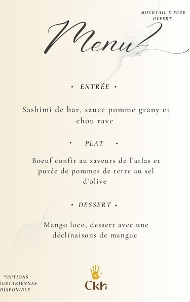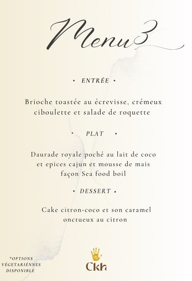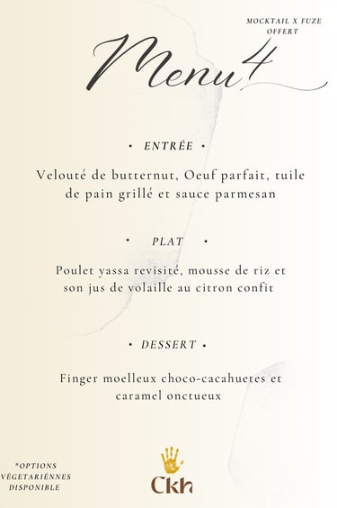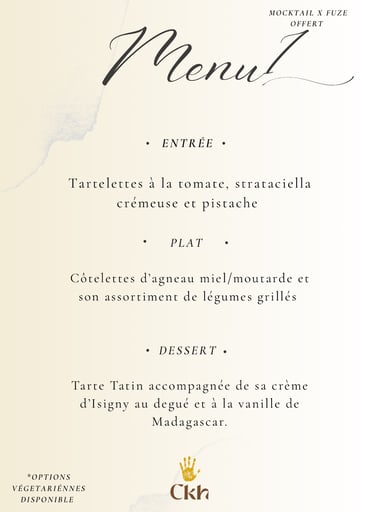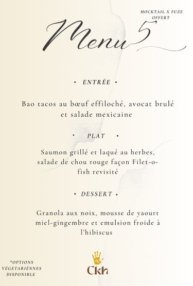 Vous avez le choix entre les 5 menus ou de faire votre propre composition avec 1 entrée/1 plat/1 dessert